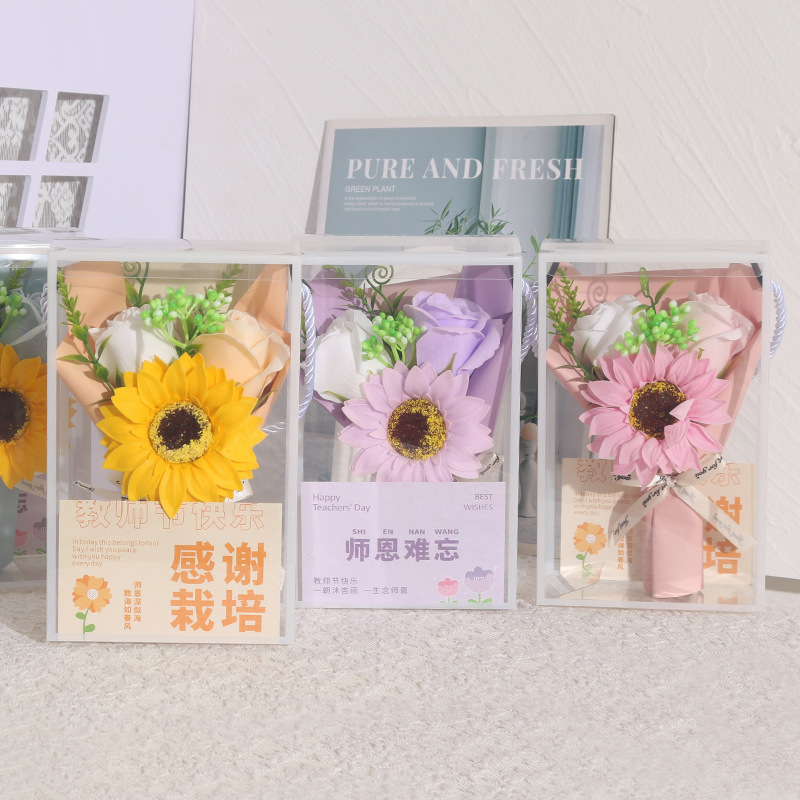 新しい教師の日の石鹸の花のプレゼントはヒマワリの花束の贈り物のセットをシミュレーションして、子供のカードの幼稚園の子供を送ります。