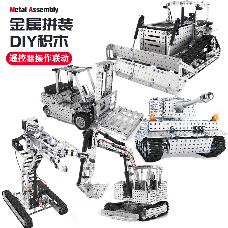 難易度の高い組み合わせモデルの知能はリモコンの掘削機の戦車のクレーンの機械の金属の積み木の組み合わせのおもちゃを組み立てます。