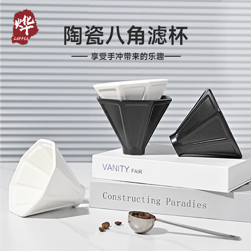 陶磁器のコーヒーのカップの手はコーヒーの八角形の濾過の漏斗のコーヒーの粉のフィルターの家庭用コーヒーポットの器具を現します。