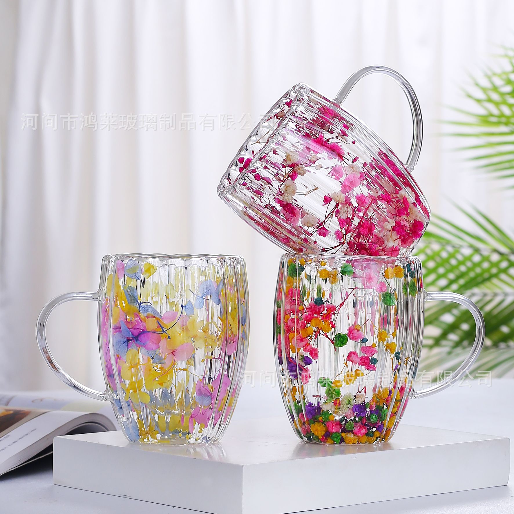 高ホウ素シリコンガラス二重ドライフラワーカップストライプ家庭用パーマ断熱コーヒーカップ創意風ハンドル付きグラス
