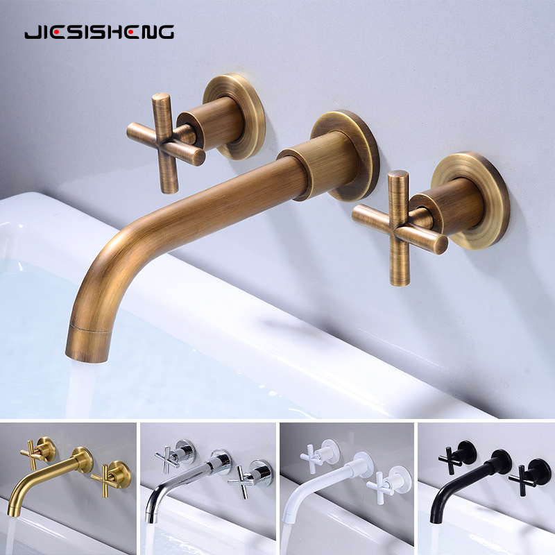 国境を越えた模造の全銅が壁に入った洗面器の蛇口のトイレに隠れて壁から三穴の冷熱蛇口が出ている