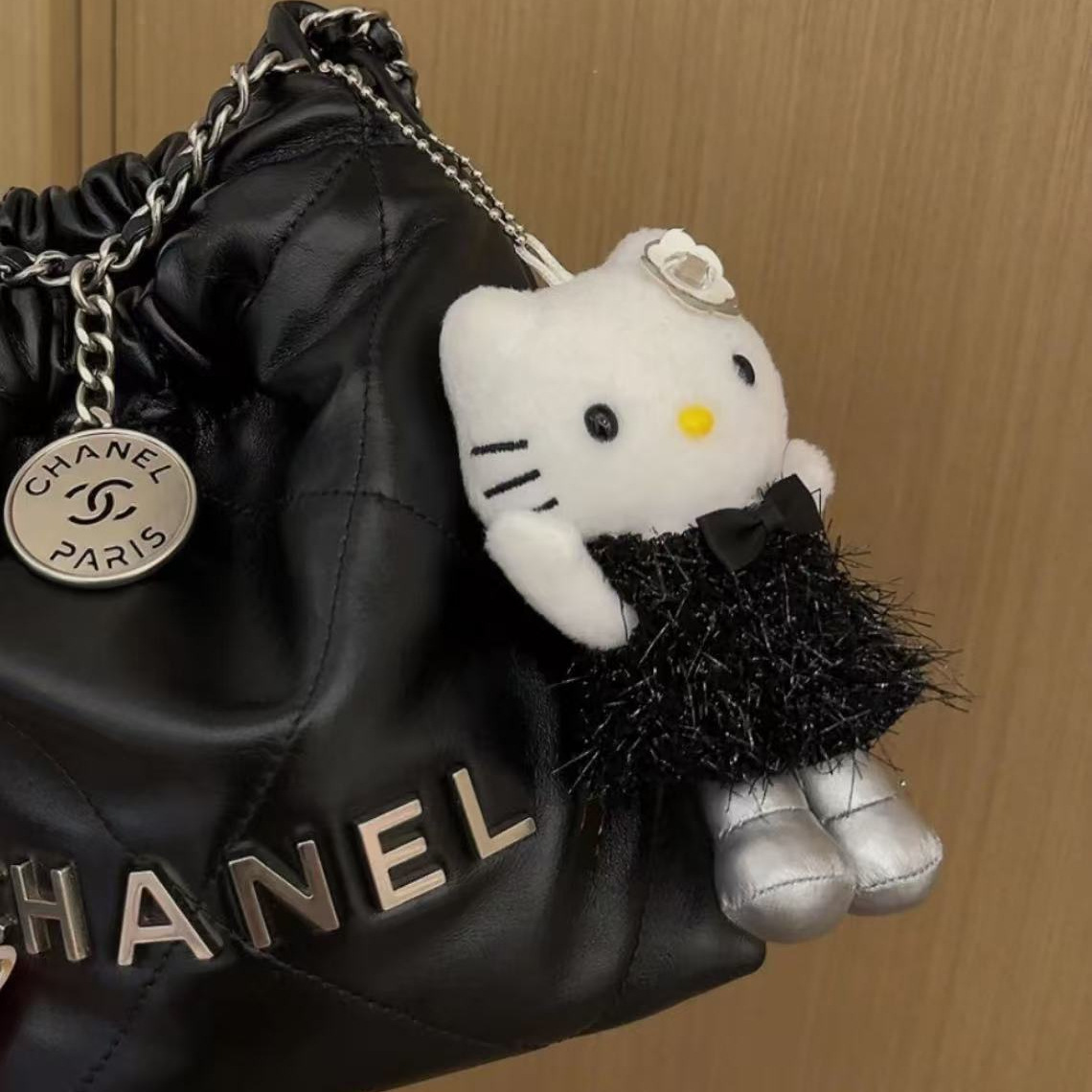 アニメのぬいぐるみKT猫のバッグにはかわいい子猫の人形のキーホルダーがついています。
