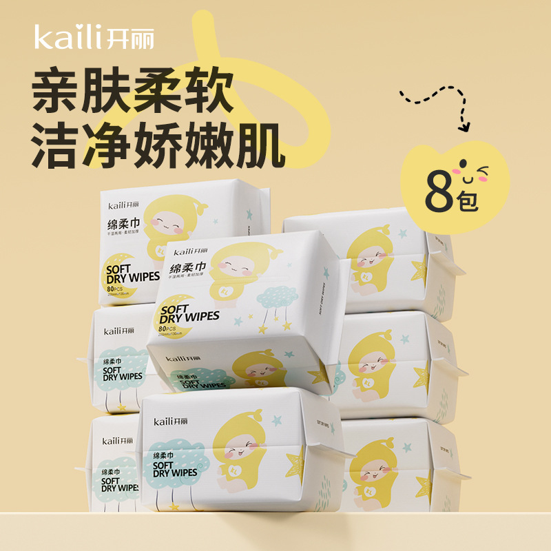 開麗赤ちゃん綿柔タオル使い捨て乾湿両用タオル新生児手口赤ちゃん紙80抽出8包20*13cm