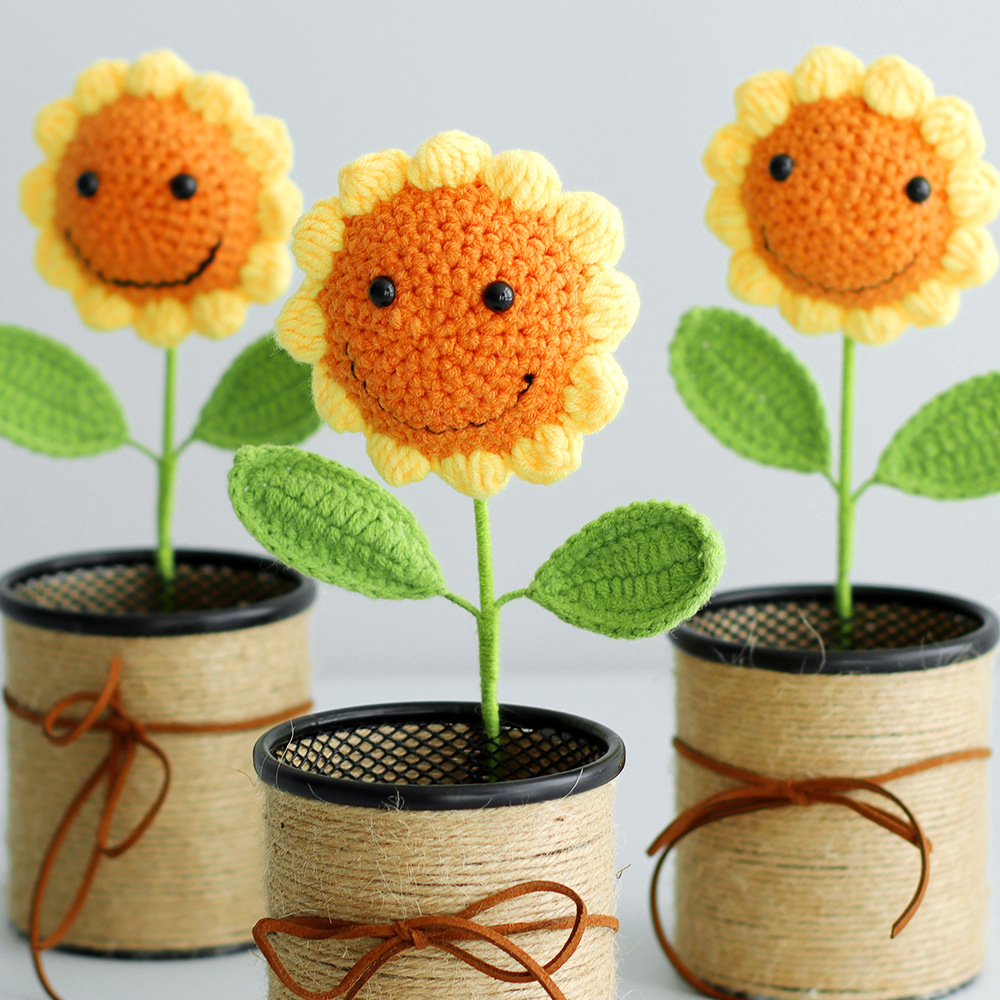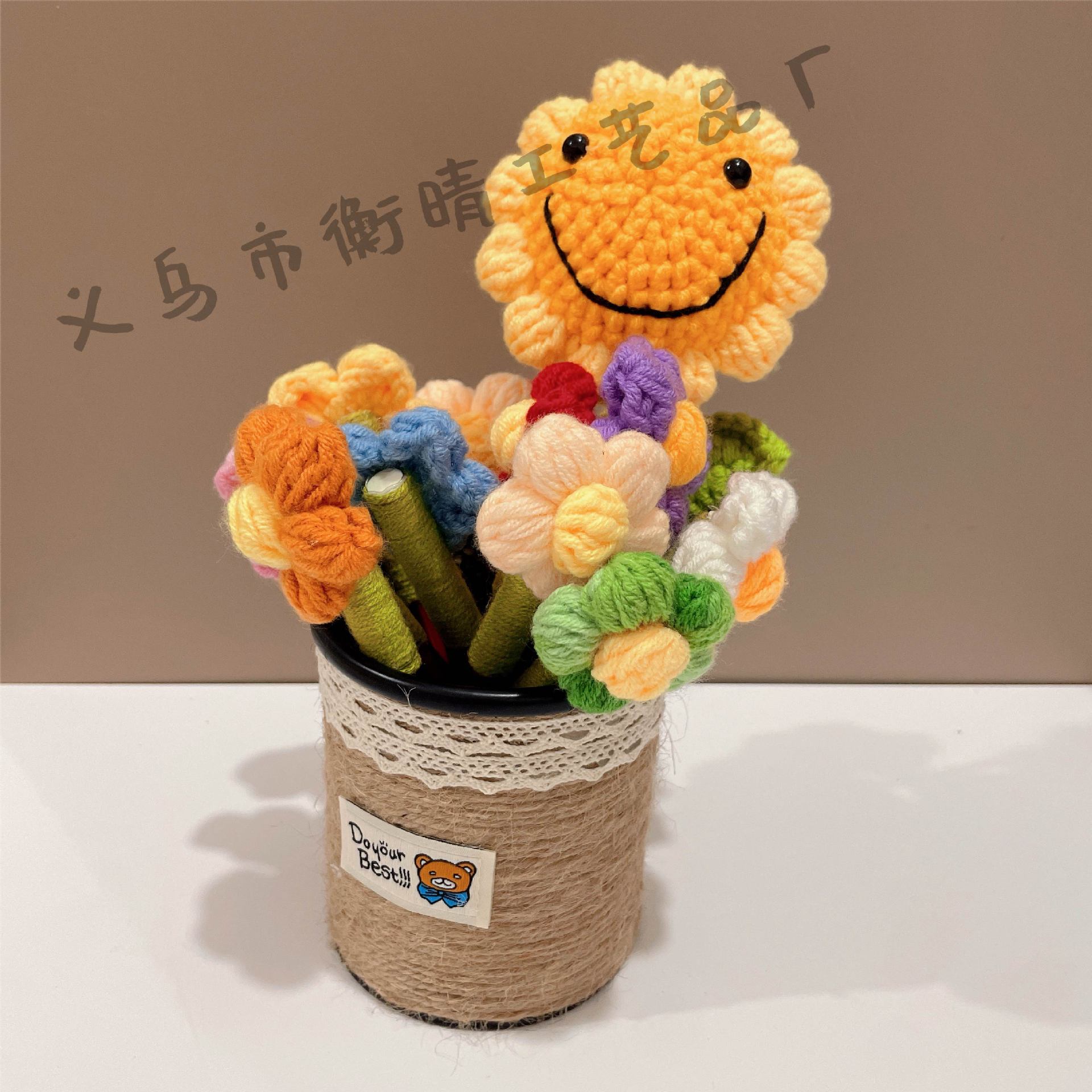筆筒笑顔ヒマワリ毛糸花模造花完成品教師の日プレゼント手作り鉢植え太陽花置物