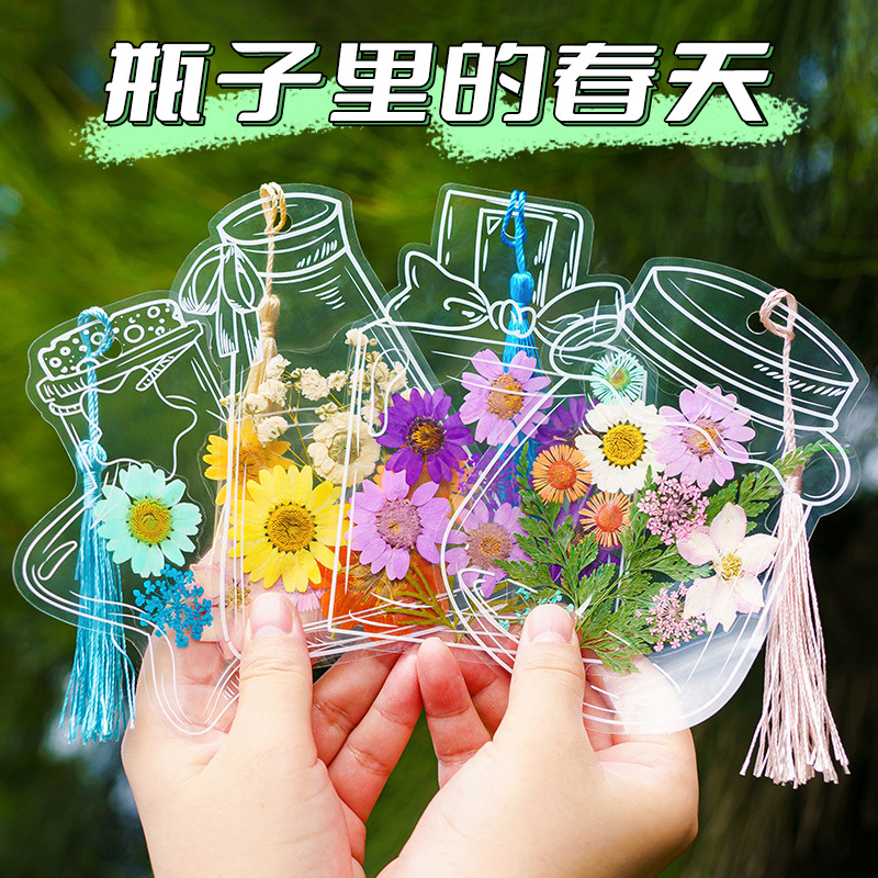 乾いた花のしおりの瓶の中の春の手作りの子供diy木の葉の標本幼稚園の環創美工区は投入します。