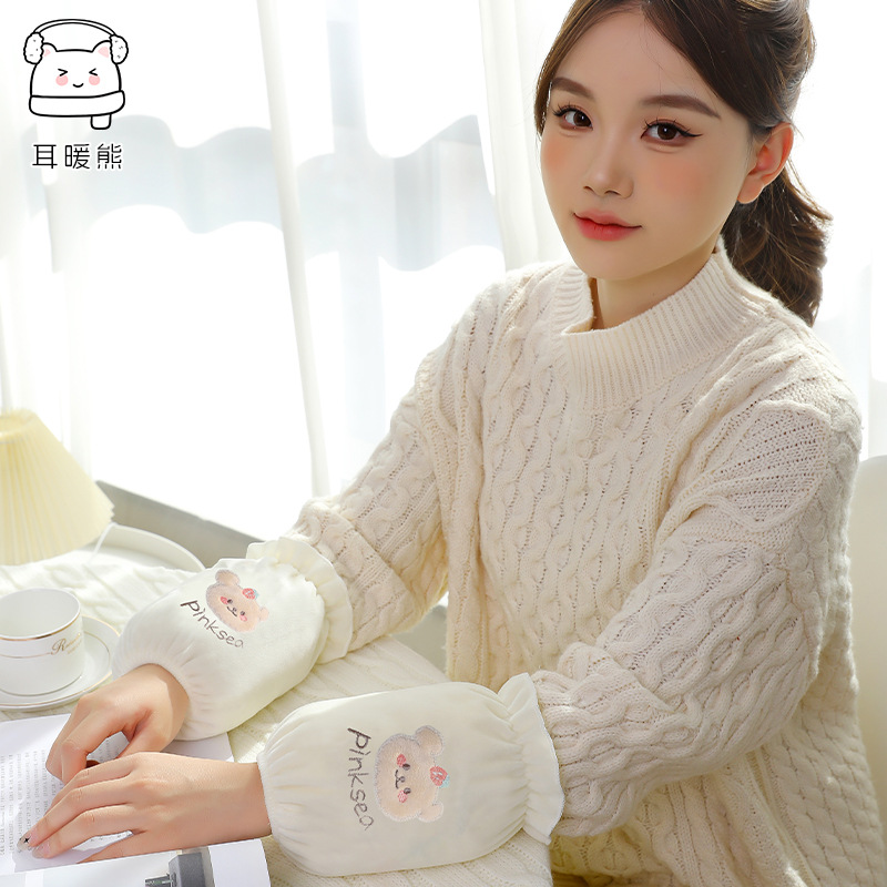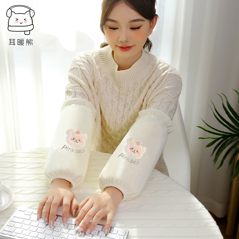 女士冬季爱心小熊刺绣水晶绒袖套学生短款选色清装绒布套袖卡通