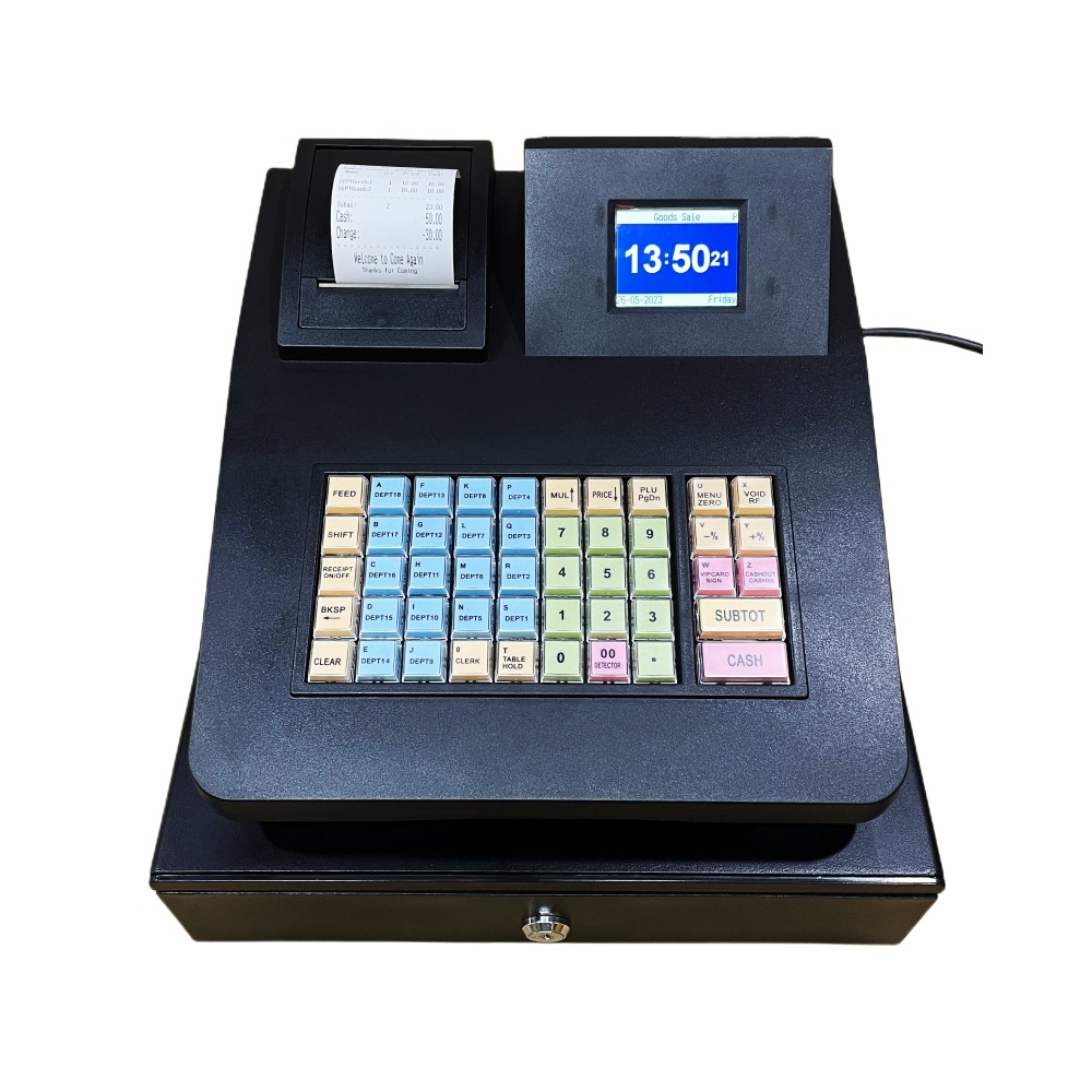 C50英語版レジにはプリンターが付属しており、紫色の光で紙幣を検出できるデュアルスクリーンレジ、スーパーマーケットのレジ、コンビニエンスストア