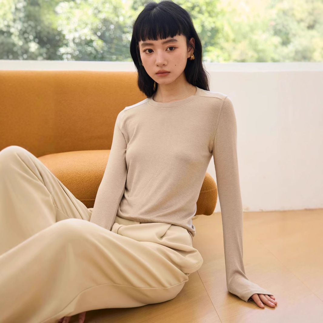 ウールとテンセル素材のレディースインナーシャツ、春秋用長袖、ラウンドネック、高伸縮性、スリムフィット、着痩せ効果、カジュアル、アウターとしても着用可能、Tシャツ