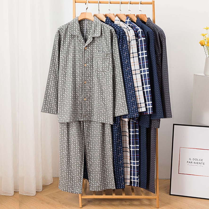 新商品の色織純綿二重ガーゼ男性パジャマ春と秋の薄い長袖のゆったりとした外着ホームウェアの卸売り