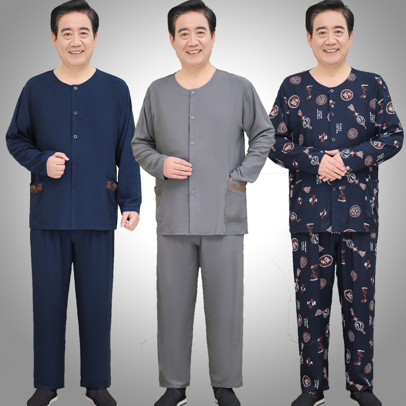 2024年の新型男性パジャマ春と秋の模造糸長袖カーディガンは、父の氷糸家服冬を着ることができる