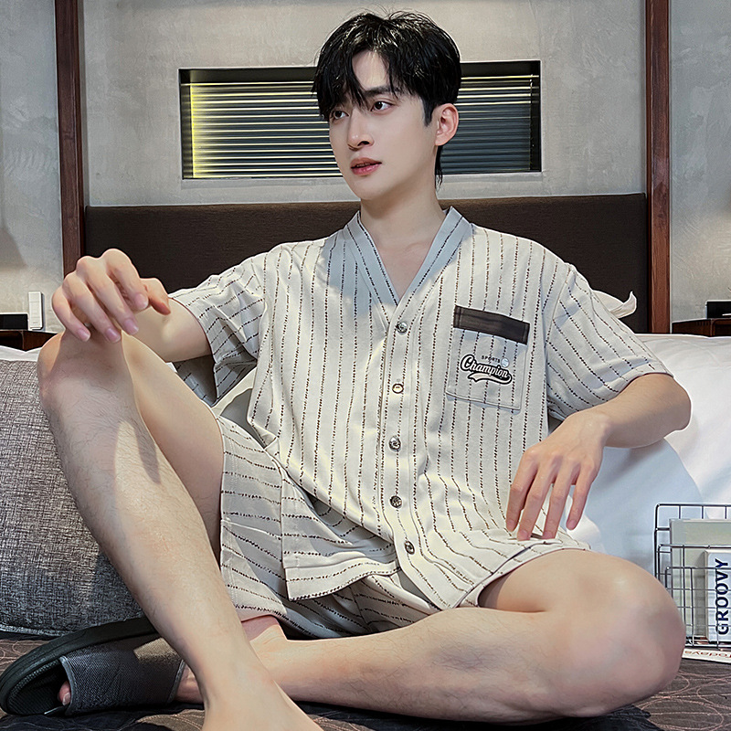2025夏の新商品は国境を越えて爆発した男性パジャマのハンサムなカーディガンと服の半袖パンツはパジャマを着ることができる