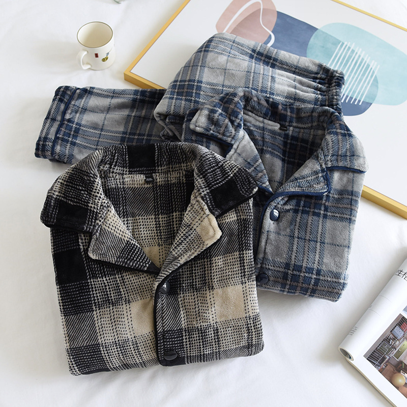パジャマ男性の冬の三層の厚いベルベットのベルベットのフランネルの大きなサイズの家庭服の保温セット