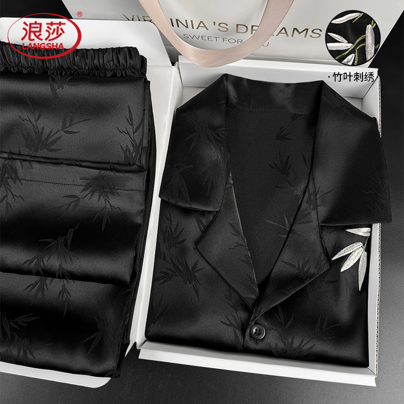 2025新作黒アイスパジャマセット竹の叶ジャカードシルクホームウェアメンズ高级感可外着
