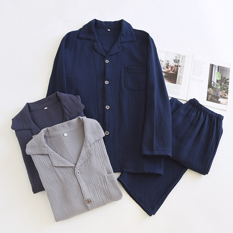 新型カップル4層綿ガーゼパジャマセット無印風襟長袖長ズボンカップルルームウェア