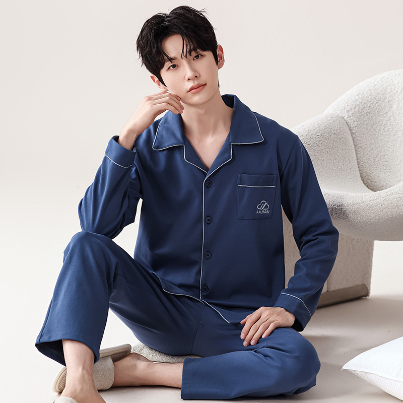 ホームウェアメンズ無地コットン長袖カーディガンパジャマセット薄くてゆったり快適で柔らかい春夏メンズ下着