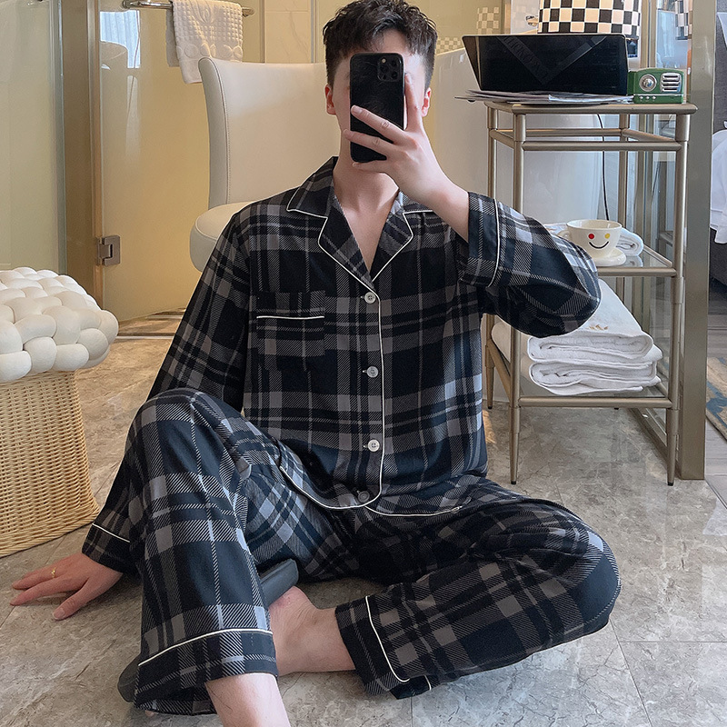 パジャマ男性春秋長袖綿の格子2025新型男性の家の服は大きいサイズの綿の服のスーツを着ることができます。