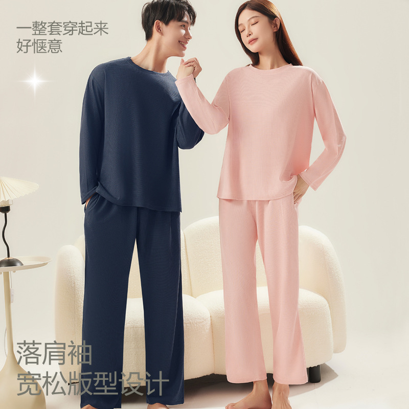 2025年大きいサイズパジャマ男女兼用春秋ワッフル長袖丸首プルオーバー無地ホームウェアセット卸売