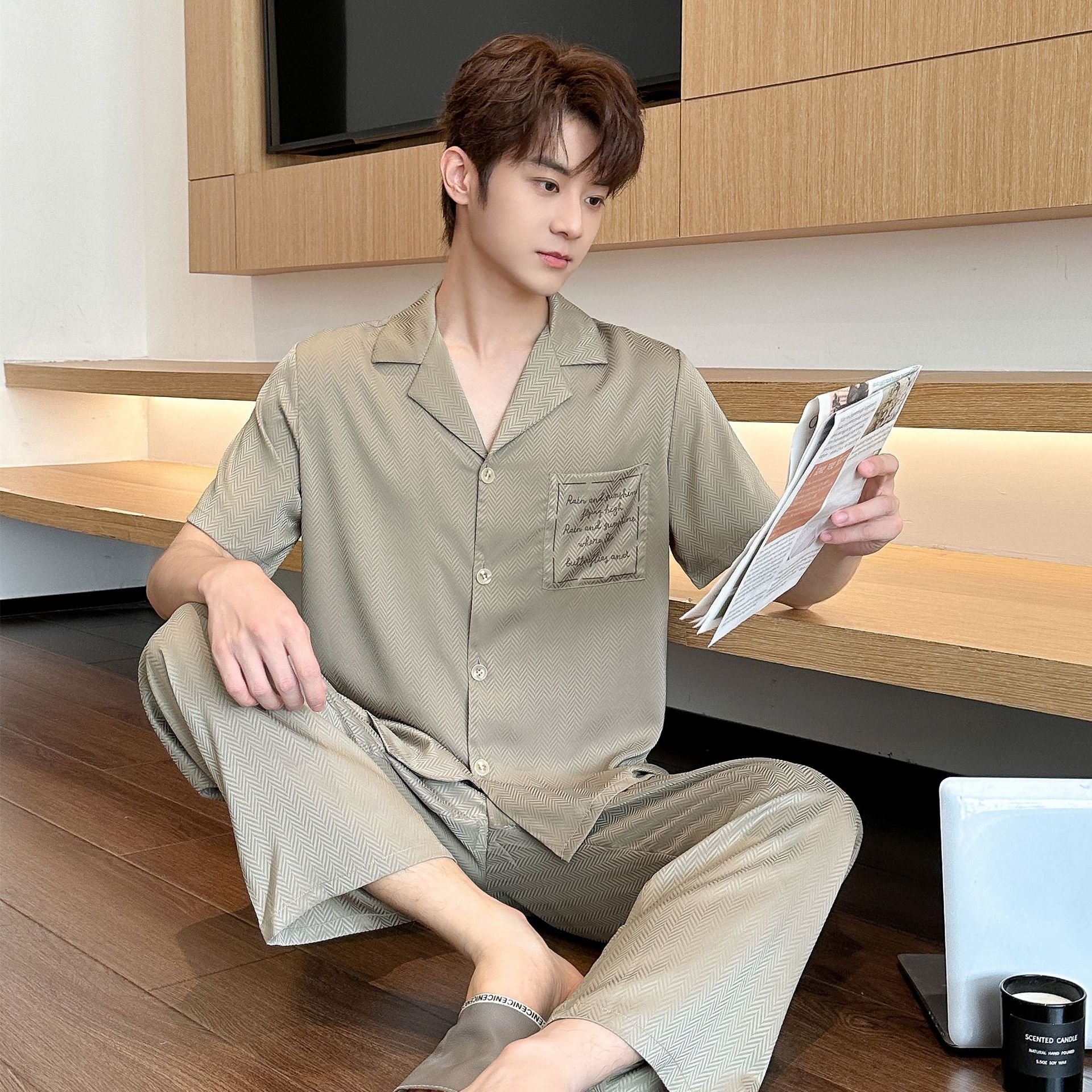 夏のシルクパジャマ半袖長ズボン高級感春と秋の薄い高級男性の家の服は父の日に着ることができます。