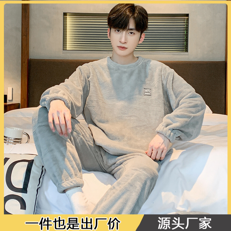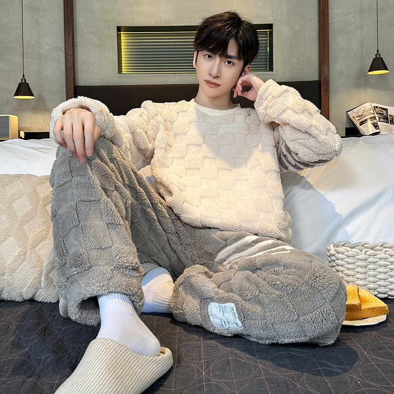 2025新型サンゴのパジャマ男性秋冬のベルベットの保温弾力性は男性の家庭服セットを着ることができる