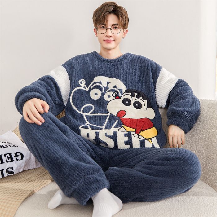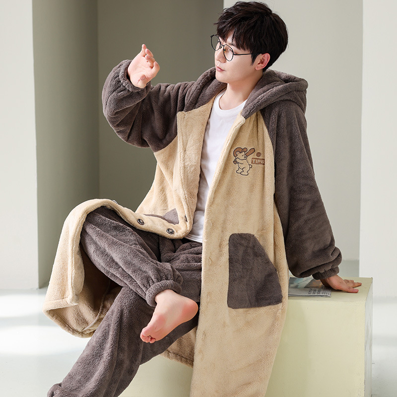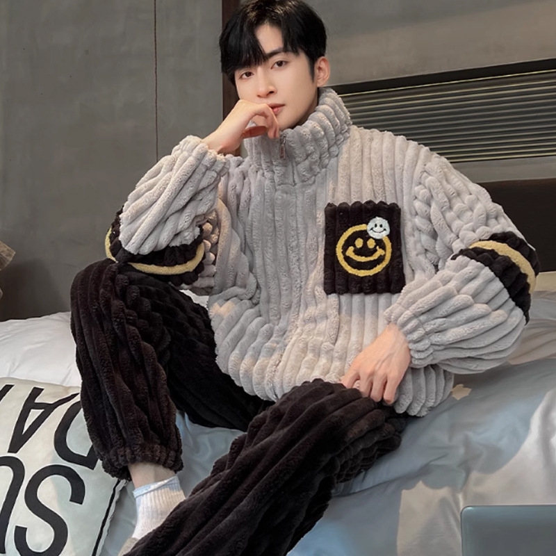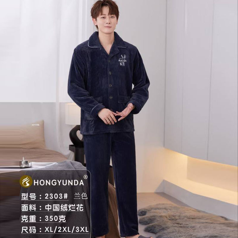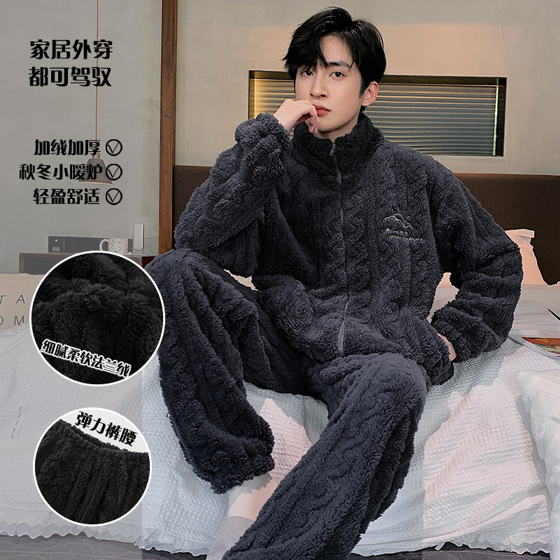 秋冬男性徳絨毛パジャマ保温磨毛長袖カーディガン家庭服セット
