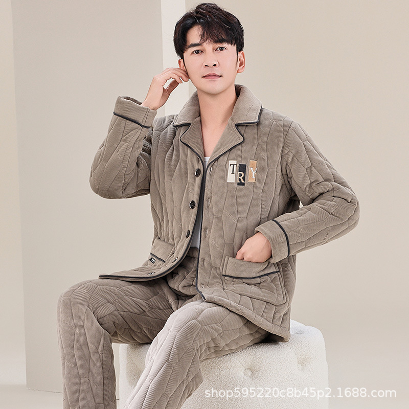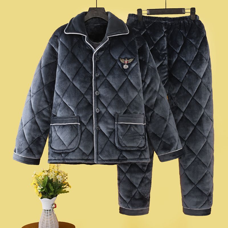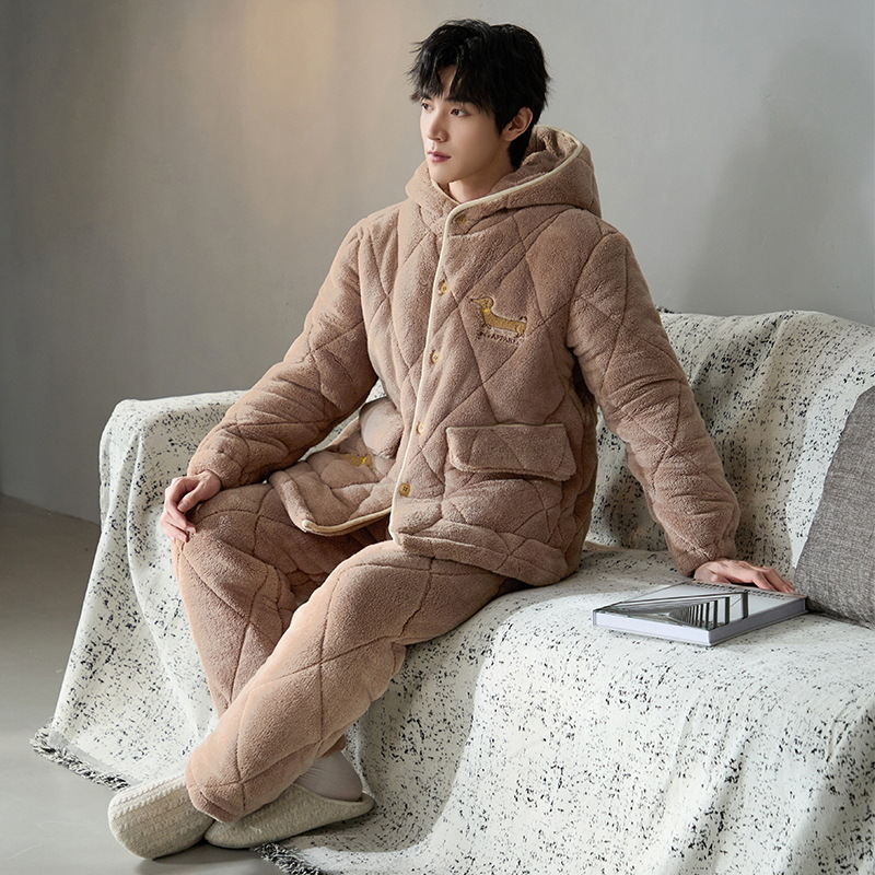 冬用メンズ三層厚手綿入りパジャマ、コーラルフランネルホームウェアセット、保温綿入りジャケット、自宅でのリラックスに
