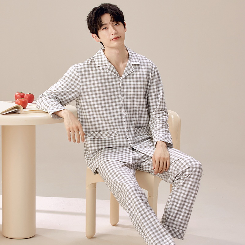 2024年の新型パジャマ男性春秋タイプの格子長袖のゆったりした大きいサイズのカジュアルな家庭服のスーツを着ることができます。
