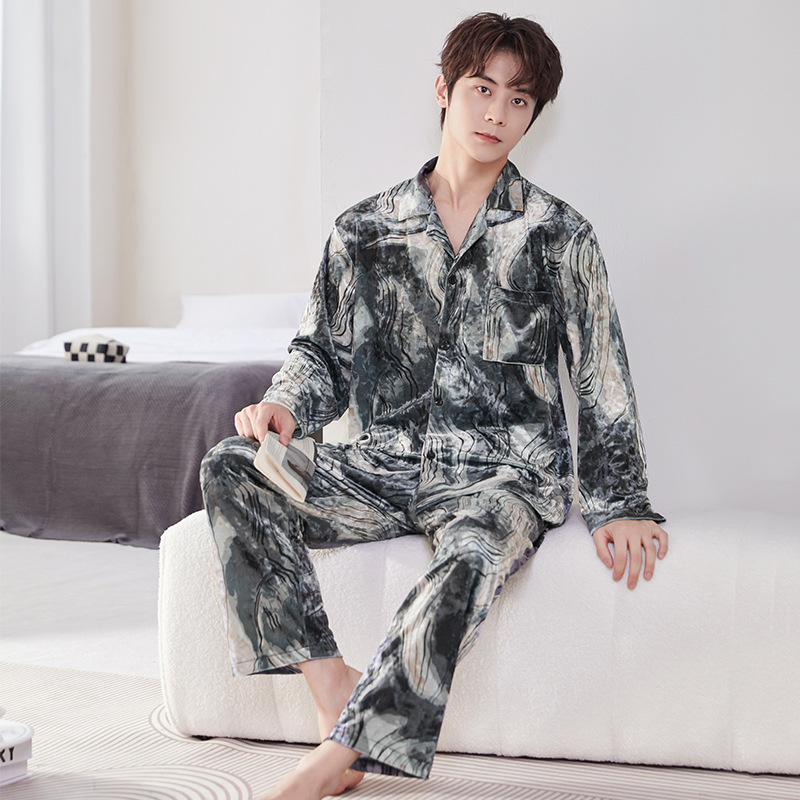 新しいベルベットのパジャマ男性春と秋の高級感の薄い長袖の軽い贅沢な襟の家の服のスーツは外で着ることができる