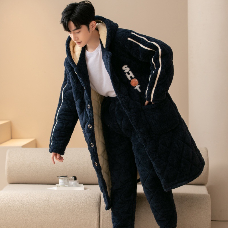 秋冬のパジャマの男性三層の綿を挟んだサンゴの毛を厚くして、冬のパジャマの男性の長いタイプの保温家の服をプラスします。