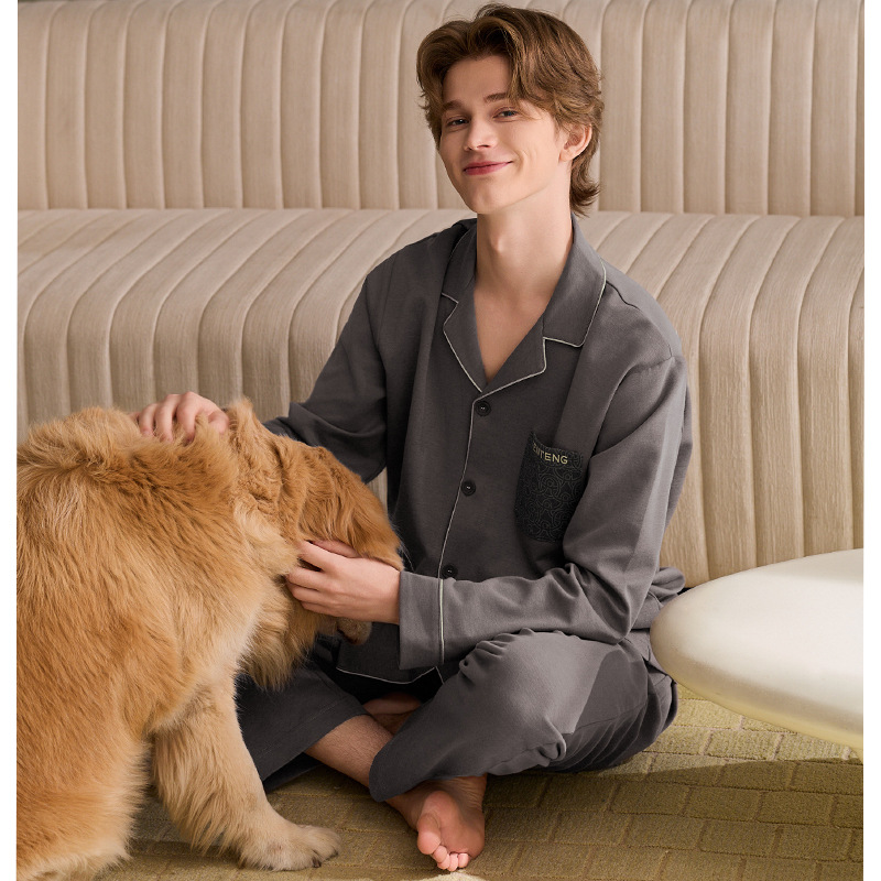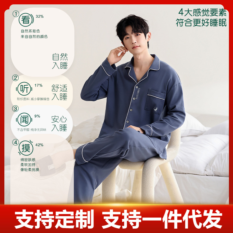 2024年純綿男性家庭服長袖長ズボンカーディガン秋冬襟セットカジュアルファッションパジャマ男