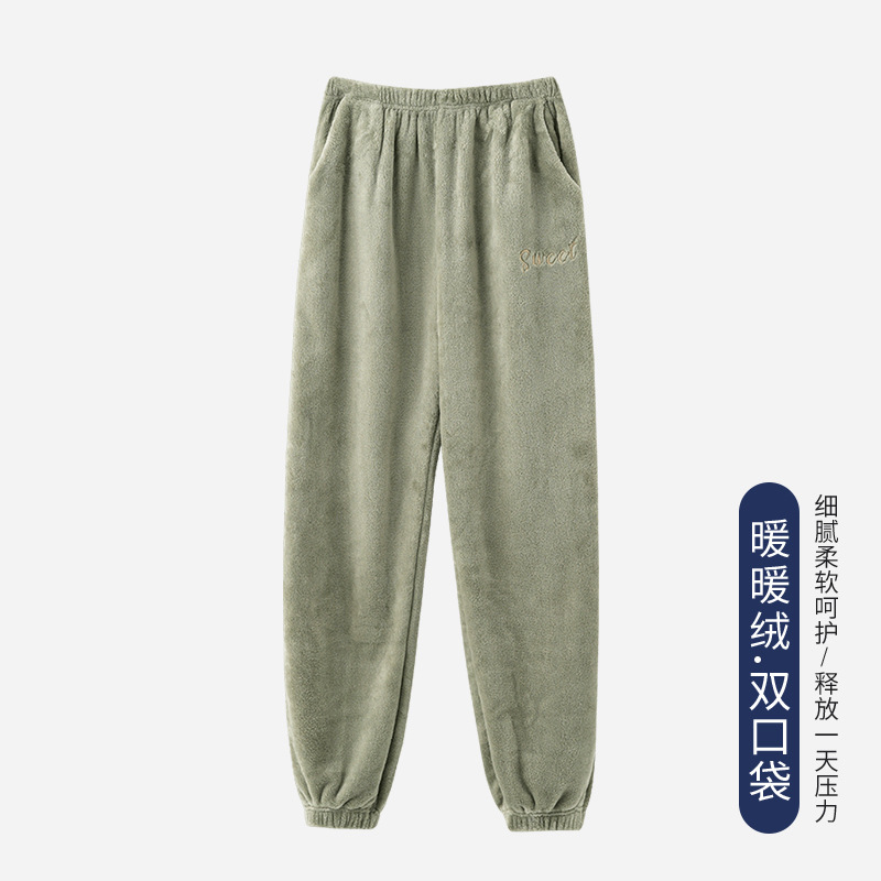 男性の寝ズボン秋冬のゆるいサンゴの毛の保温のズボンの2024の新型のシンプルな墨の緑色の男性の家のズボン