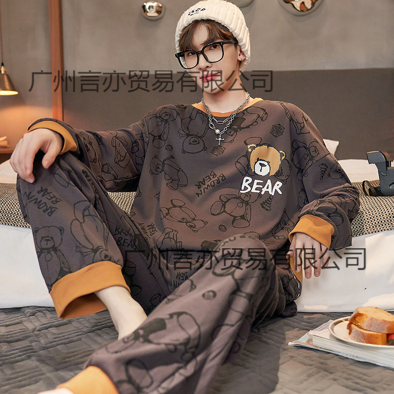 【海島パイル】パジャマ男性スタイル秋冬厚手プリント高級感保温スーツ男性コーラルベルベット家庭服