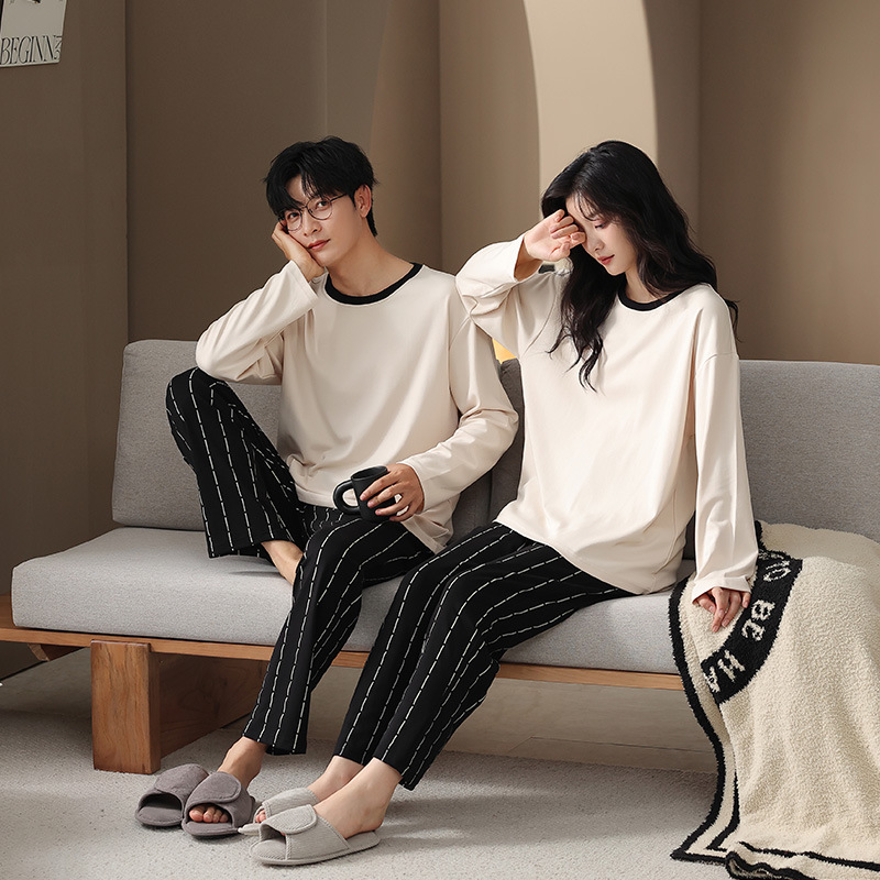 高品質カップルパジャマ女性春モーデール長袖男性純色シンプルで家庭服セット