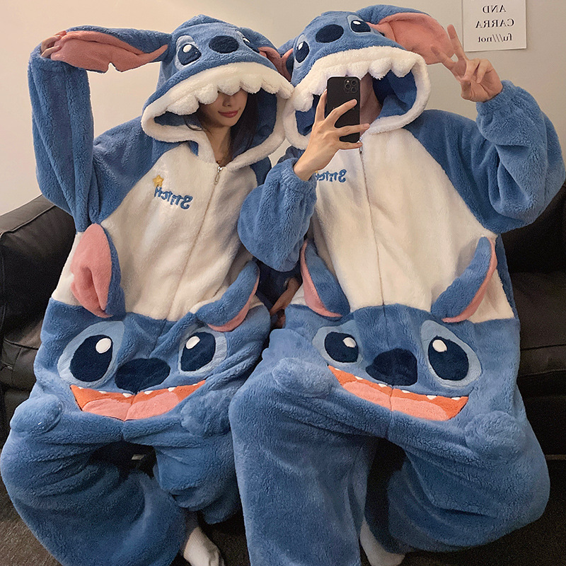 冬の連体カップルのパジャマの女性漫画のスティッチとベルベットの厚い保温男性のフランネルと帽子の家の服
