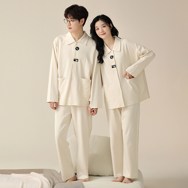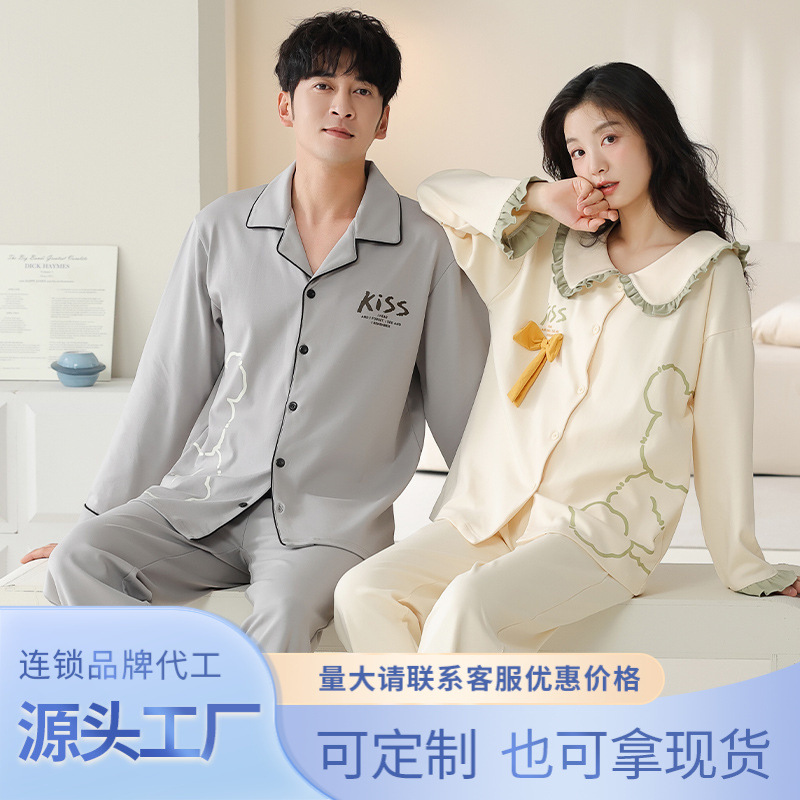 純綿綿カップルパジャマ女性春と秋の甘くて可愛いセットカジュアルカーディガン長袖男性用ホームウェア外着可
