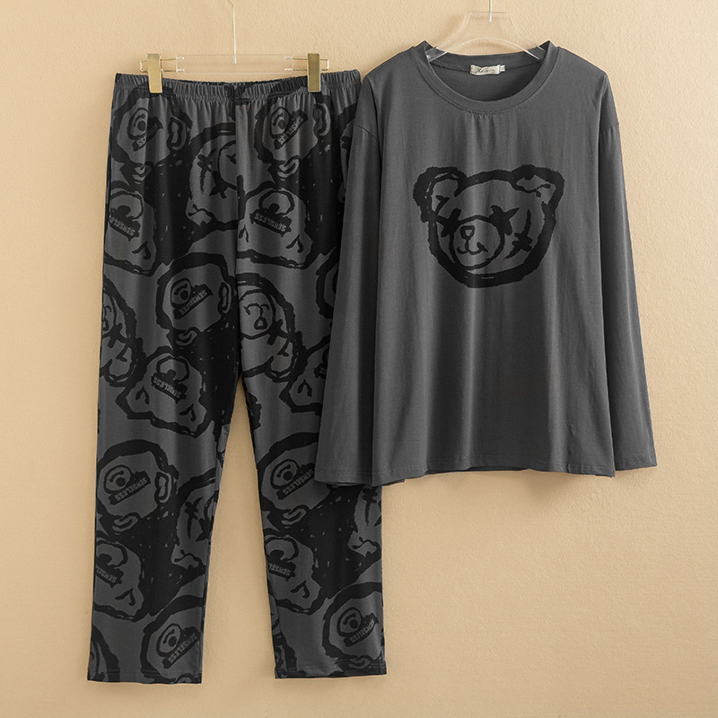 かわいいベアーの大きいサイズの太ったmmの純綿のパジャマの女性の春と秋の丸首の長袖のズボンの200斤の男性の家の服のスーツ