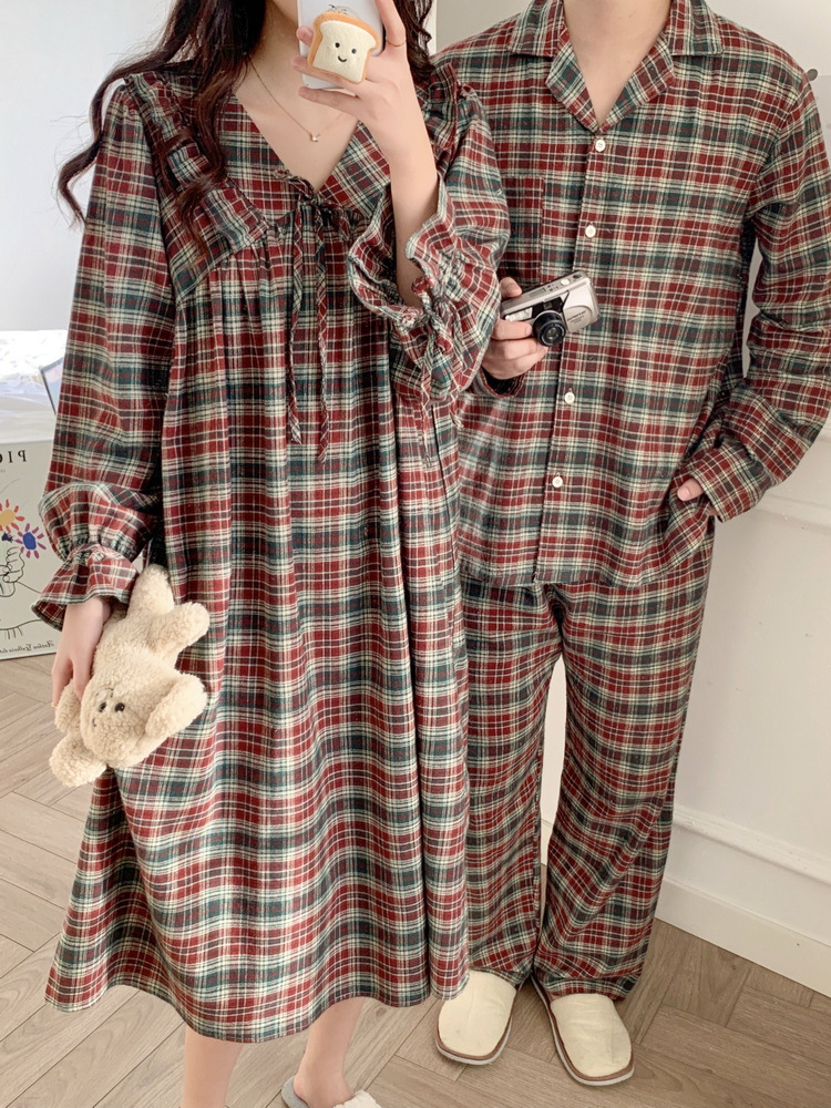 韓国秋冬新作クリスマス格子カップルパジャマ長袖ゆったりカジュアルパジャマ女性ホームウェア男性