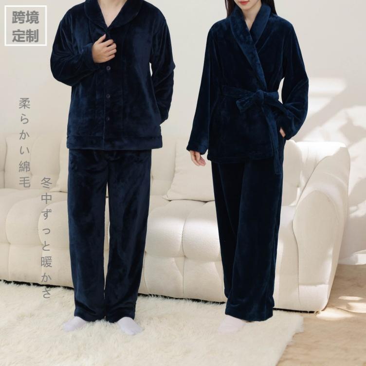 秋冬カップルパジャマ男女折り襟帯ホームウェア2点セットフランネル厚手ガウンバスローブ