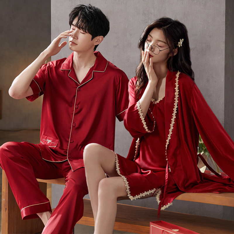 カップルパジャマ女性の春と秋のドレッシングガウンレッドアイスシルクセクシーなナイトガウン結婚式新婚男性半袖秋のお祝いスーツ