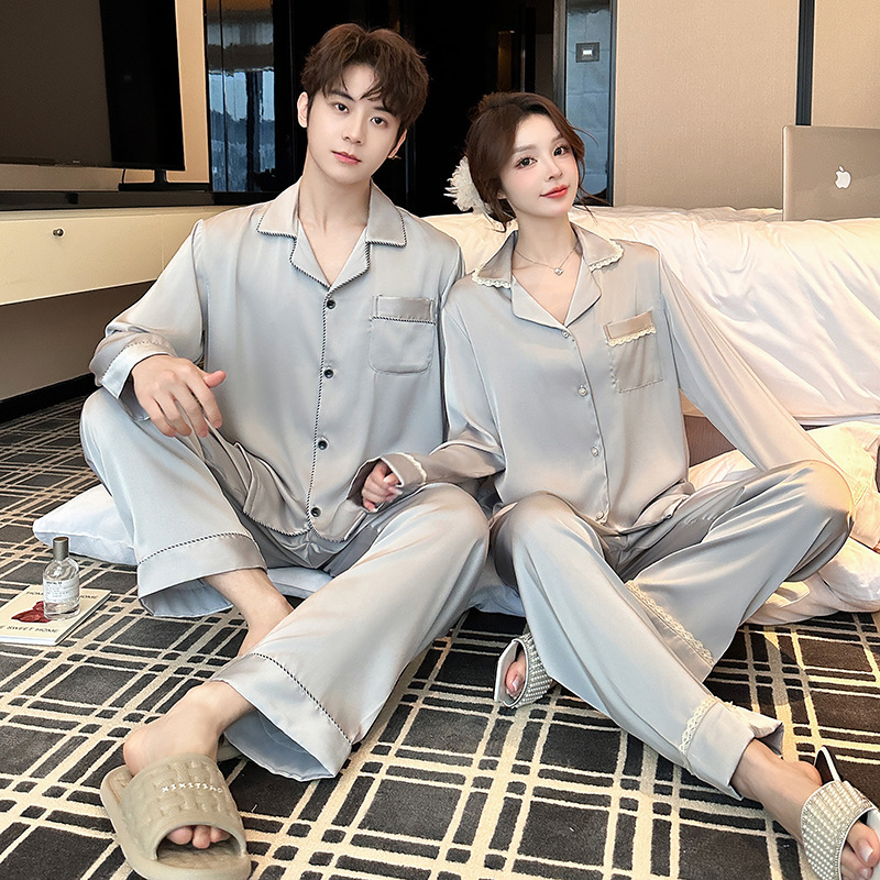 2023新型春秋シルクカップルパジャマ女性秋氷シルク男性パジャマ長袖大サイズカバー