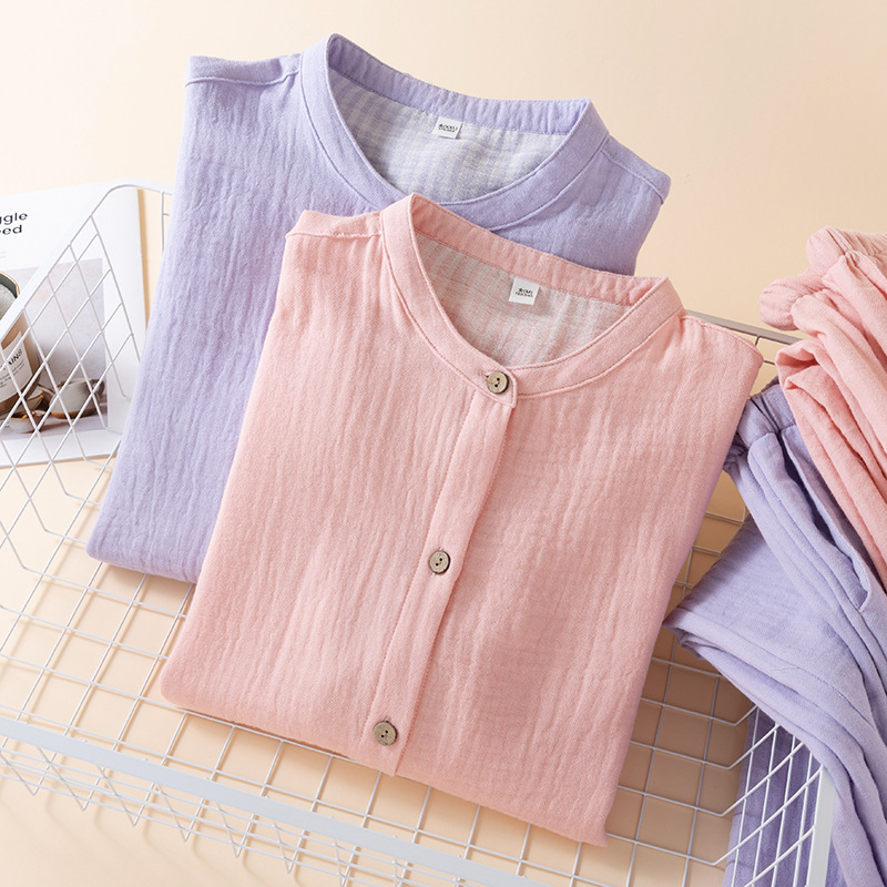 春と秋のカップルの綿のパジャマの二重ガーゼの女性はシンプルです。