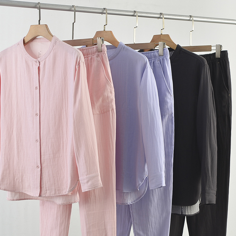 日本製純綿ガーゼパジャマカップル春夏先染め無地カジュアルホームウェアメンズ長袖ズボンスーツ