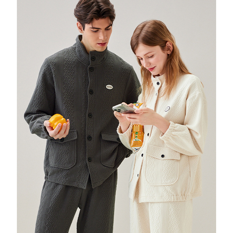 純綿カップルパジャマ 秋冬長袖無地シンプルカーディガンホームウェア 春秋男女兼用綿パジャマ