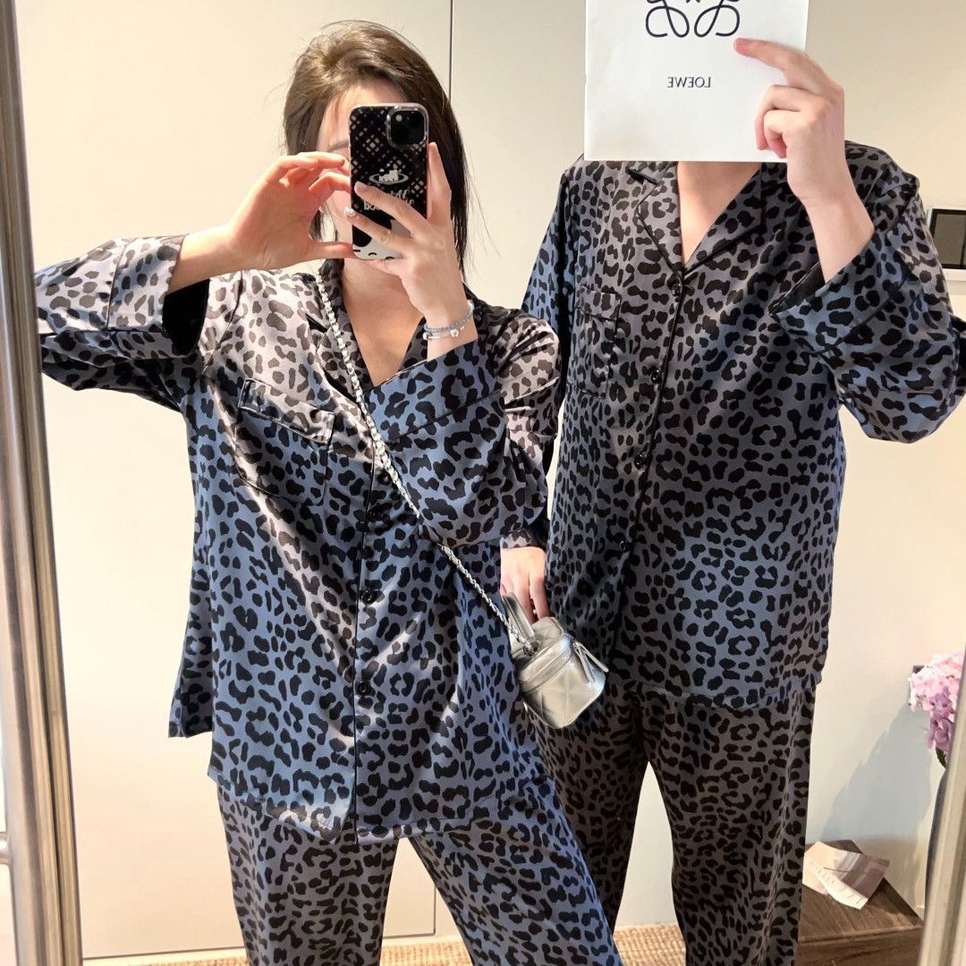 2025新型長袖豹紋カップル氷糸家庭服セット韓国版ins風復古男女シルクパジャマ