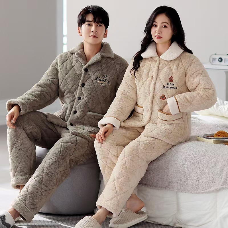 2024年の新型カップルパジャマ冬のサンゴのベルベットの三層の綿を挟んで、男性女性の家庭服セットを厚くした