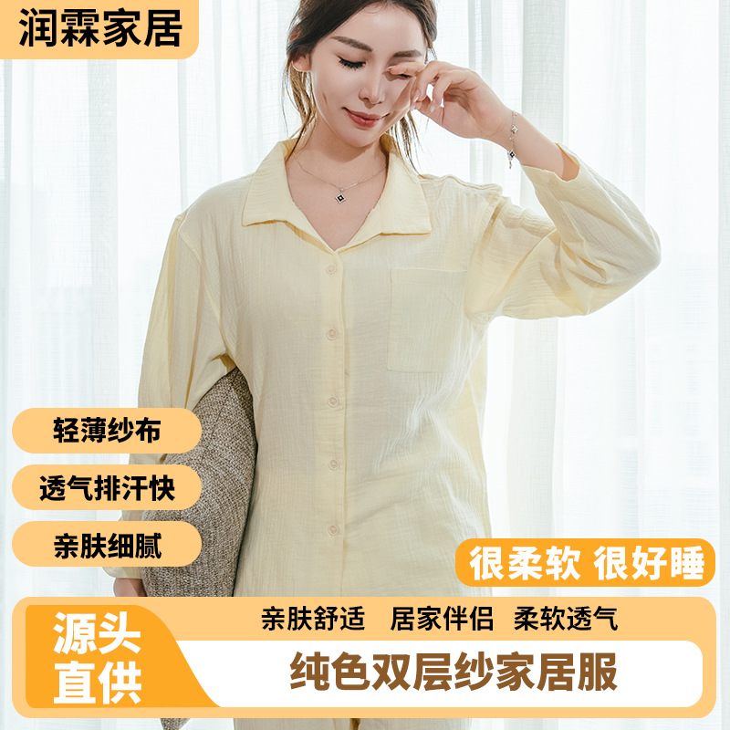 日本の純綿二重ガーゼパジャマセットズボン男性と女性の長袖カップルスタイルホーム服卸売は屋外で着用できます