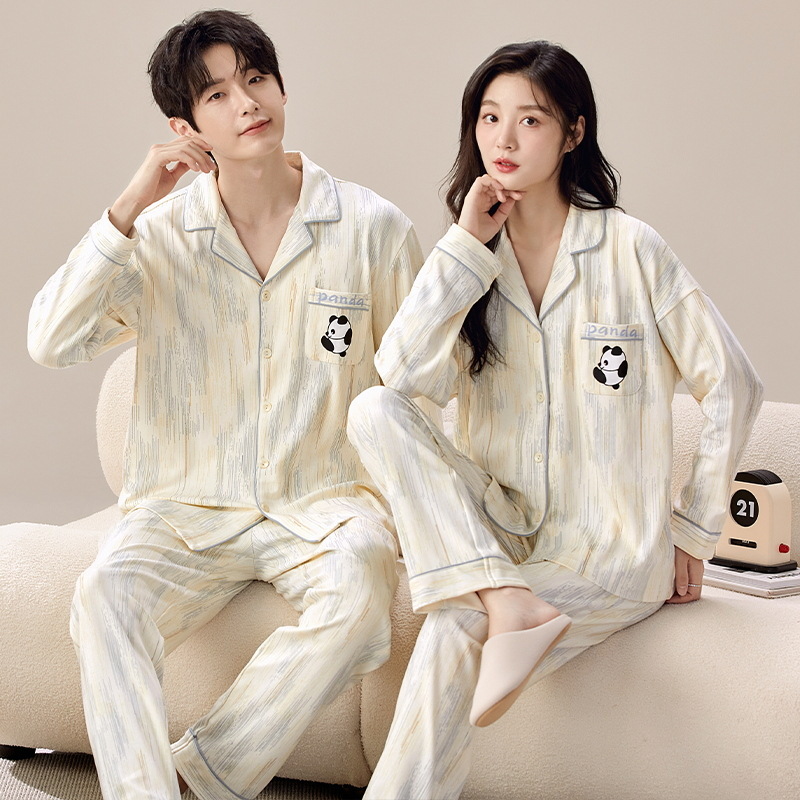 長袖カップルパジャマ抗菌綿ラペル高級感メンズレディースホームウェアセットモランディカップルスタイル