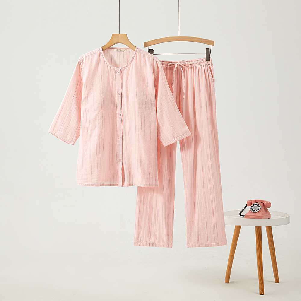 60本の純綿の七色の二重の紗の春夏のパジャマの女性の胸のパッドの7分の袖のスーツの七色の紗のカップルの部屋の服