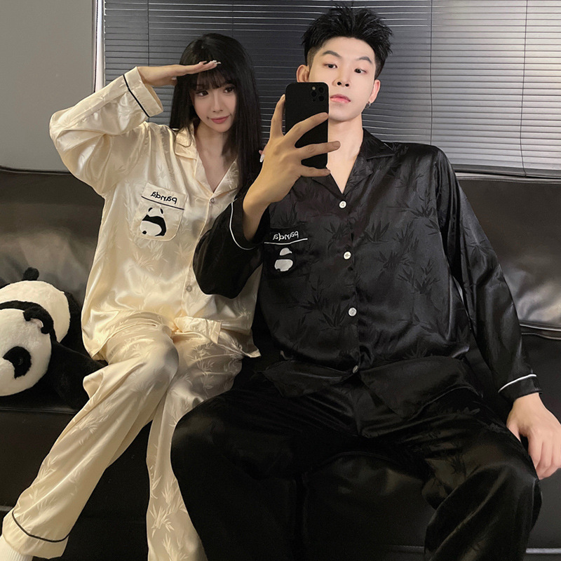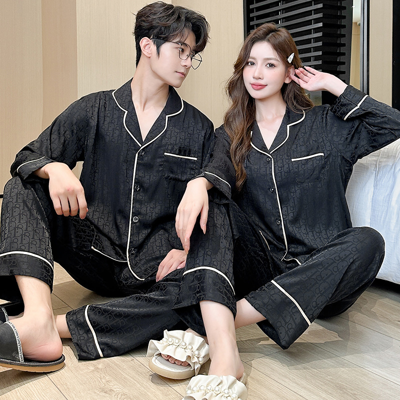 カップル用アイスシルクパジャマ、女性用シルク風薄手韓国風、男性用ジャカードゆったり大きいサイズ長袖春秋ホームウェア