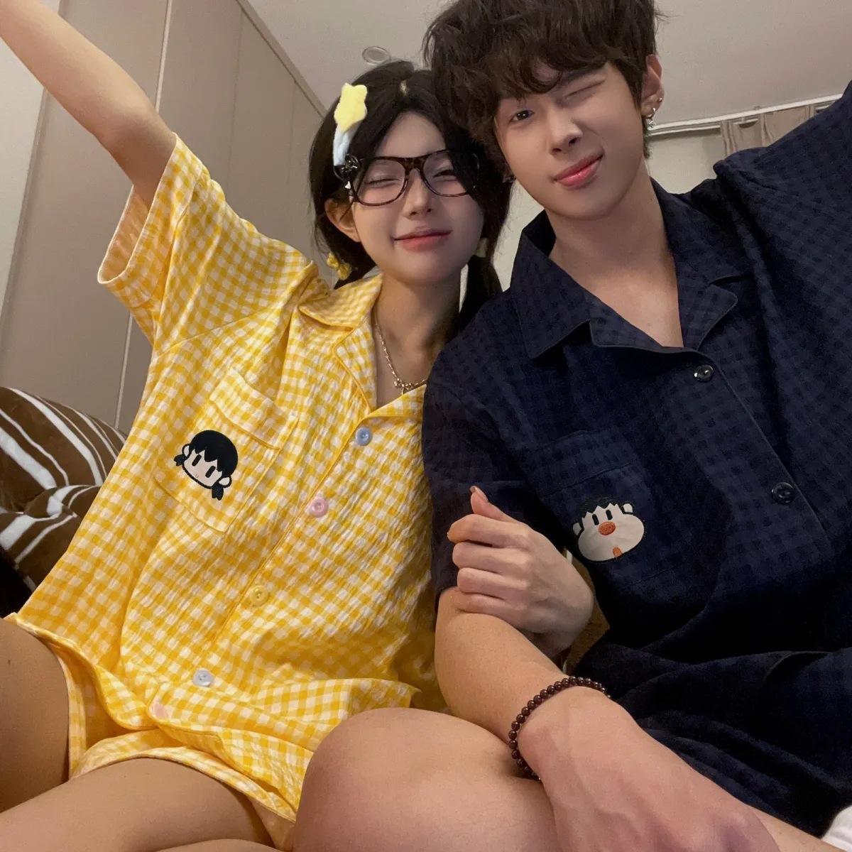 カップルパジャマ夏の女性の韓国スタイルプリント半袖ショーツスーツメンズ薄手カーディガンルーズアイスシルクホーム服