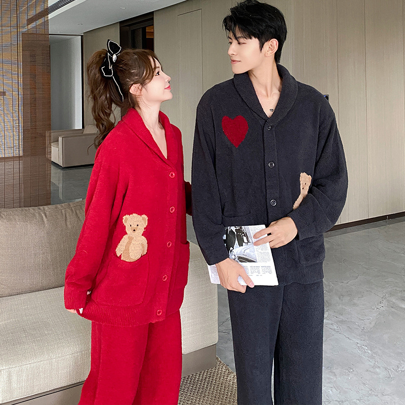 漫画の熊のカップルのパジャマの女性の半分の絨毯の秋冬の新型の赤いカーディガンの男性の保温はスーツを着ることができます。